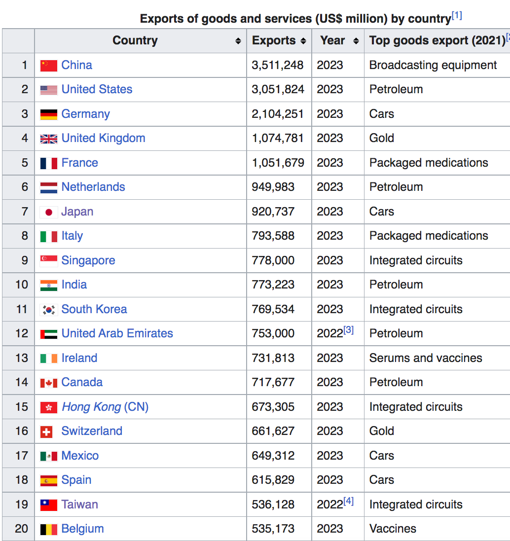 The European Common Market was created in 1957 with 6 members; France, Italy and West Germany, plus the three Benelux countries. The smaller European countries have traditionally been the most anti-nationalist members of the EU, as they have the most to lose from the bullying behavior of larger countries. They also have the most to gain from free trade zones. Take a look at the world’s biggest exporters. How many of you knew that the Netherlands exports more than Japan?