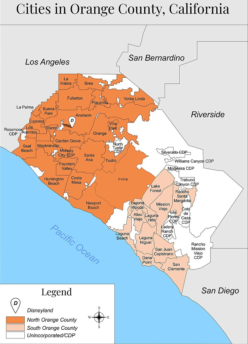Orange County is located on the coast, just south of LA County. (Map at bottom of post.) Not surprisingly, development mostly proceeded from the north to the south, with one exception. During the second half of the 20th century, Orange County’s rapid development largely missed Irvine, and jumped further south to communities like Lake Forest and Mission Viejo. That’s because Irvine’s development was controlled by the Irvine Company, which proceeded at a very methodical rate.