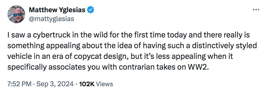 I guess Yglesias and I have different taste is car styling. (And not because I’m anti-Telsa; I’d happily own a sleek blue Model S.) His tweet caught my eye because just a day earlier I was bicycling in the newer part of Irvine, and saw 4 cybertrucks within a half mile area. The streets in that neighborhood have names like Interstellar, Pulsar and Redshift. You can guess the ethnicity. Don’t even think of moving there unless you’re cool with your children being the dumbest kids in their class.