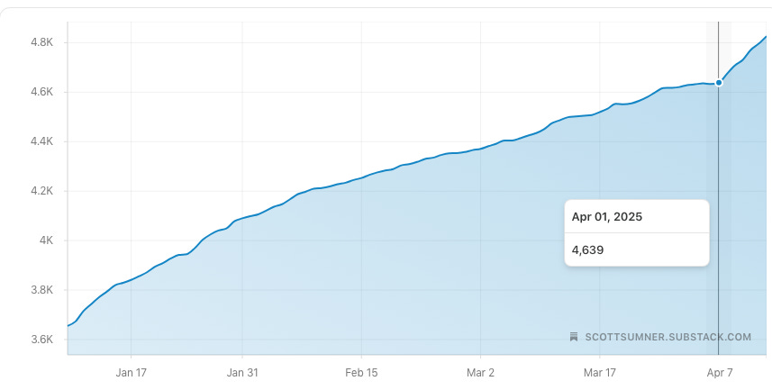The financial market response to the policy is sending a clear signal that the tariffs are likely to hurt both the domestic and the world economy. Yes, “Wall Street is not Main Street”, but there are many market indicators pointing to weaker real economic growth, beyond just falling stock prices. These include a slightly weaker dollar, falling commodity prices, and a sharply elevated risk of recession in prediction markets. This certainly does not mean “armageddon” (the level of stocks is still not all that low), but it’s clearly expected to be a net negative.