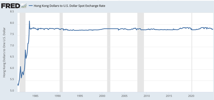 Since 1983, Hong Kong’s monetary authority has been targeting the exchange rate at 7.8 to the US dollar, (allowing slight fluctuations within the 7.75-7.85 range.)