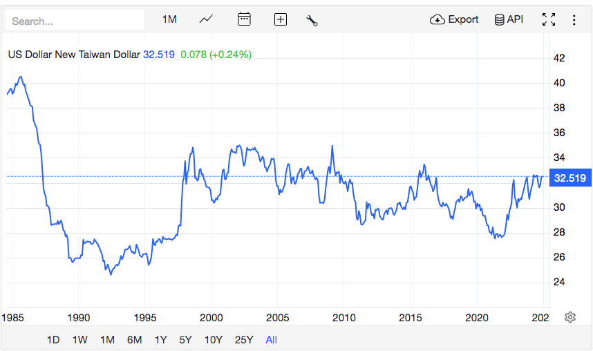 Because people are not used to thinking of macroeconomic aggregates such as inflation in finance terms, let’s start with a simpler example involving exchange rates, and then use the insights to examine inflation. Let’s compare the exchange rates for Taiwan and Hong Kong (both against the US dollar), over the past 40 years. Here’s Taiwan’s dollar: