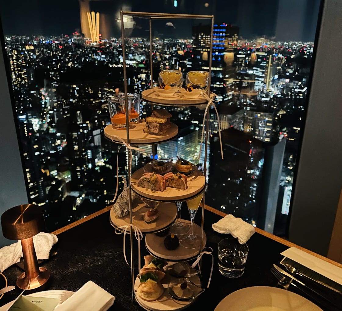 I’ll try not to bore you with too many prices—almost everything in Tokyo is 1/3 to 1/2 of the price you’d pay in NYC or LA. For Americans, it makes sense to splurge on multi-course meals, such as this stack of 12 appetizers on the 52nd floor of Tokyo’s Mori building (total cost $47 for two people.) The high rise also contains a good art museum, where I saw an exhibit of Louise Bourgeois’ work.