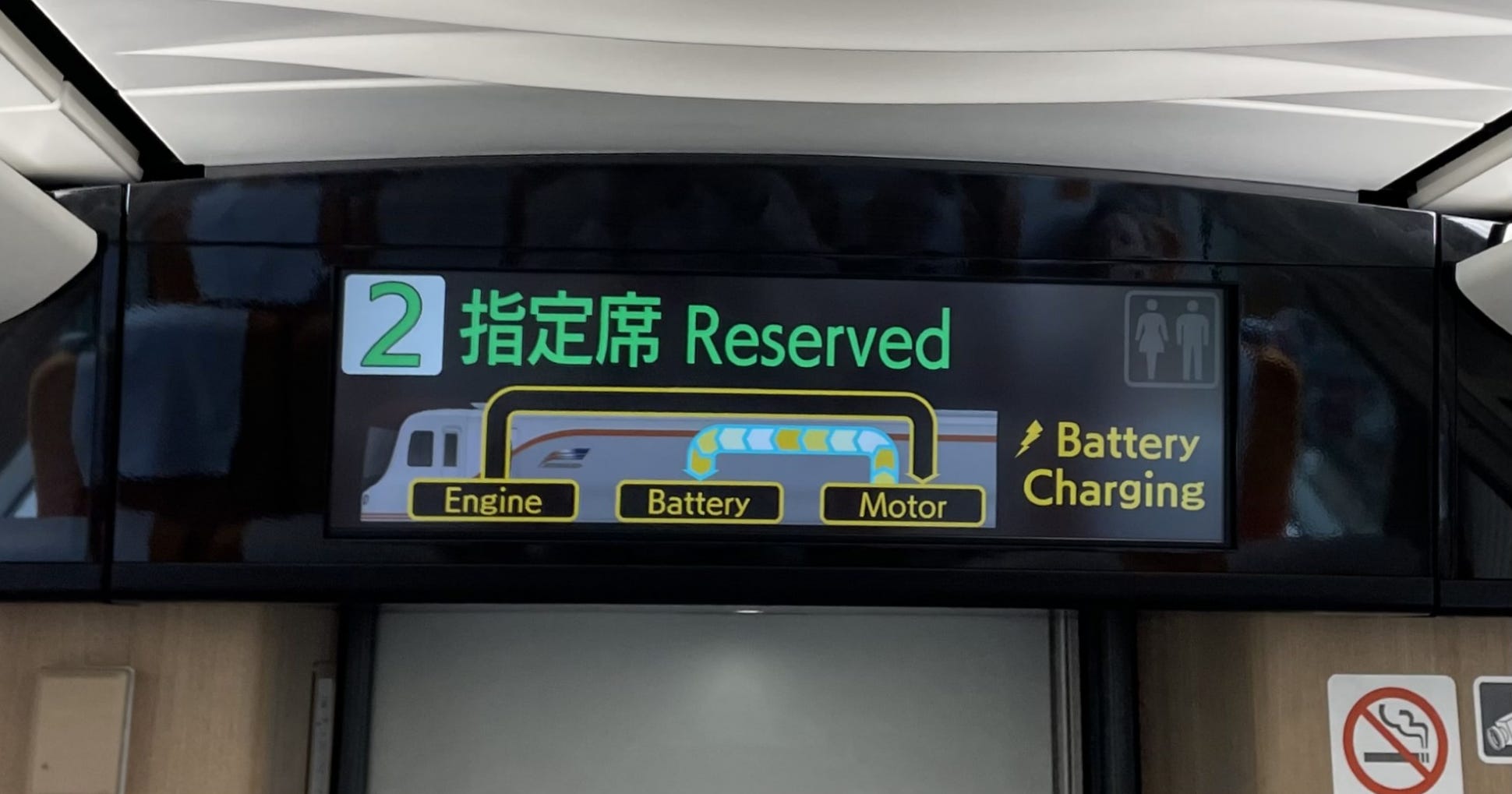 When the train is braking, a screen in each car shows the battery recharging: